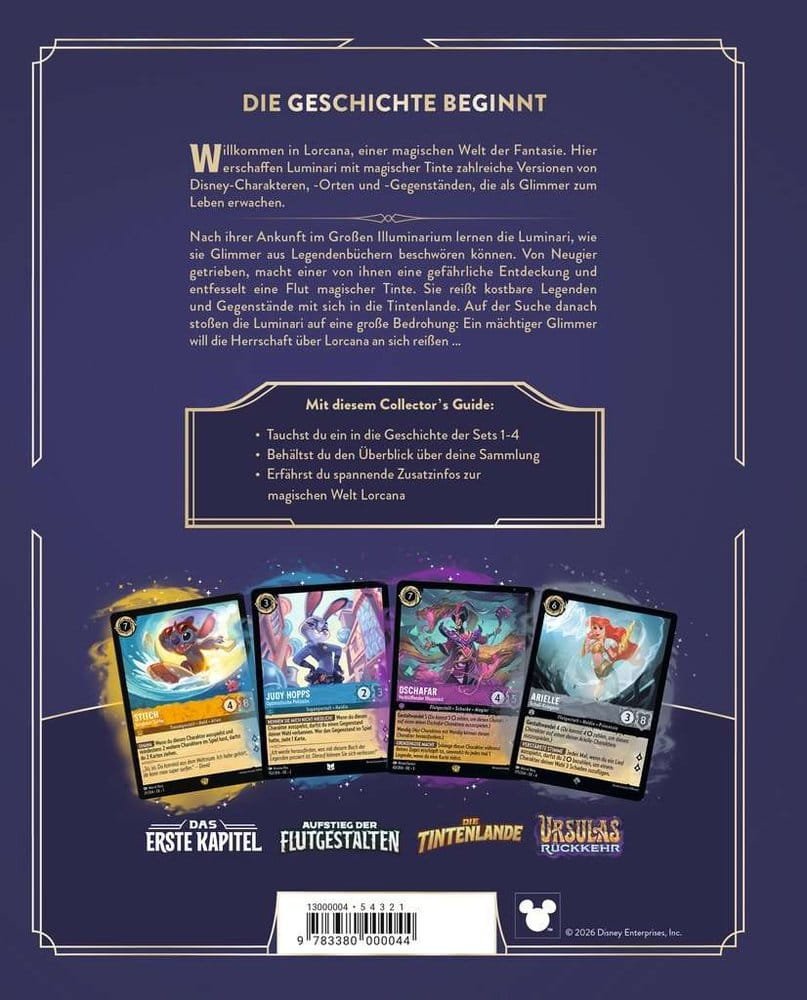 Welcome to Lorcana, a magical world of fantasy! After arriving in Lorcana, the Luminari learn how to summon Glimmers. Driven by curiosity, one of them unleashes a flood of magical ink. It sweeps precious treasures with it into the Inklands. In their search, the Luminari encounter a great threat. This first Collector’s Guide tells the story of the game and includes an overview of all cards from sets 1 to 4 – the perfect companion to the Disney Lorcana Trading Card Game for collectors, players, and Disney fans! Disney Lorcana is a popular trading card game where players experience exciting adventures with their favorite Disney characters. But it’s more than just a game: in the magical world of Lorcana, stories await at every corner. Here, Luminari use magical ink to summon countless Glimmers of beloved Disney characters, places, and items, and embark on adventures to protect and preserve the stories in Lorcana. The official Collector’s Guides to the Lorcana TCG combine these stories with exciting Easter eggs and an overview of all cards from a year. The first volume contains the stories and a card catalog of these sets: “The First Chapter”, “Rise of the Floodborn”, “Into the Inklands”, “Ursula’s Return” and “Illumineer’s Quest: Deep Trouble”. More info at disneylorcana.com