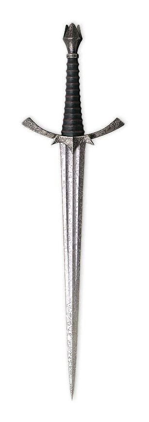 This authentically detailed dagger is a reproduction of the prop used by the Witch-King™, the leader of the Ringwraiths, as featured in New Line Cinema’s ´The Lord of the Rings™-The Fellowship of the Ring.´ United® Cutlery, industry leader in fine movie reproductions, has meticulously recreated the actual prop under the direction of replica design supervisor Kit Rae. This officially licensed replica has been authentically ´aged´ and ´battle worn´ with a distressed, acid-etched finish to duplicate the original movie item as closely as possible. The 43 cm blade is crafted from 420J2 stainless steel, rather than the original prop’s carbon steel, in order to guarantee that the replica will last a lifetime with little maintenance. The cross guard and pommel are cast metal and the grip features an ´aged´ genuine leather wrap. This item includes a 25 x 37 cm wood wall display plaque with a silkscreen design. Each replica is laser-serial-numbered on the blade.