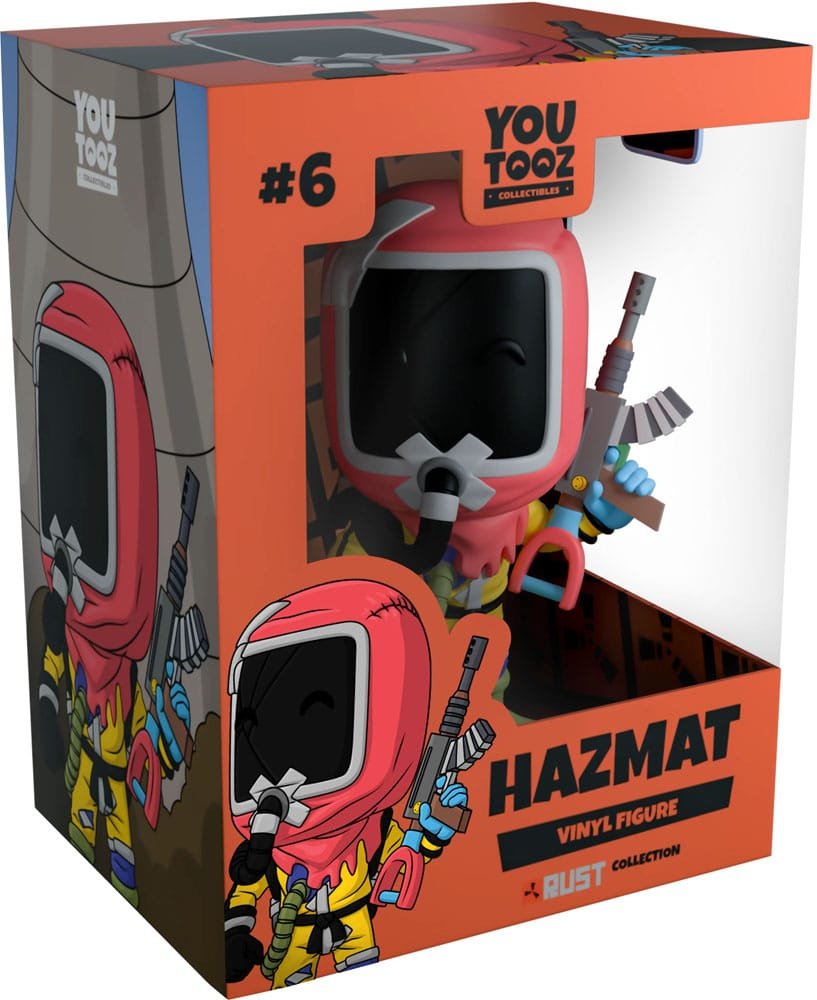 Standing at 4.6 inches tall and having just traversed through and irradiated landscape, he wears a coral colored hazmat hood that has a large cracked visor and has been hastily fixed with duct tape as the black tube that has been attached haphazardly to its front runs over his shoulder to the light grey canisters on his back. Holding a machine gun up in his left hand and wearing an outfit that has been scraped together with bits and pieces to make do, his yellow jumpsuit is tattered and patched with tape and blue materials as he wears mismatched gloves and olive green boots. The exterior of his packaging sees an abandoned building that has been overgrown by thick green trees. While the interior is a repeating pattern of the ‘Rust’ logo over a brown background, the protective sleeve is a serene forest scape under a low sun and displays his figure through the large clear plastic window at its front. This collectible was designed in collaboration with the community member @therealracckun, ships in a matte, embossed, protective outer sleeve and a custom sized plastic protector for maximum protection during shipping.
